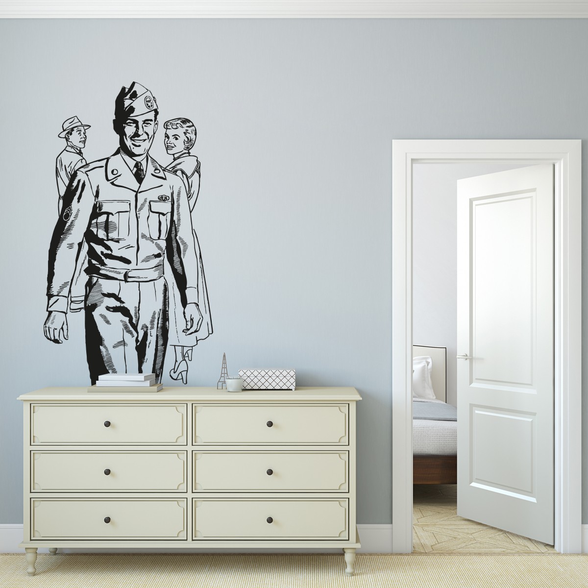 Si estás pensando en decorar tu habitación con una estética vintage o retro, este vinilo decorativo de un soldado de los años 50 es el complemento ideal.