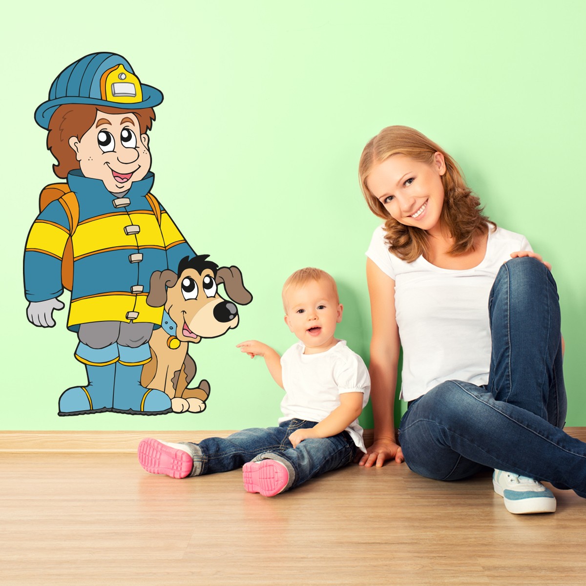 ¡Que divertido ver una habitación infantil decorada con dibujos! Este vinilo infantil de un bombero y su perro seguro que queda genial en el dormitorio o cuarto de juegos de tu peque.