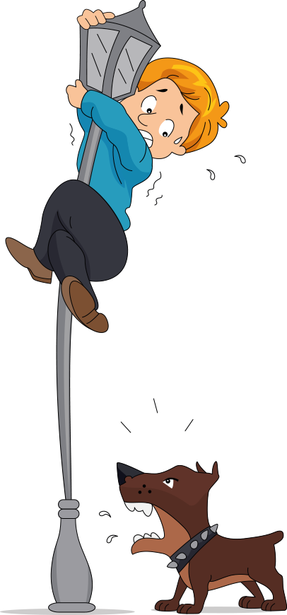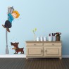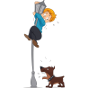 Divertido vinilo infantil de una ilustración de un niño subido a una farola mientras un perro ladra.