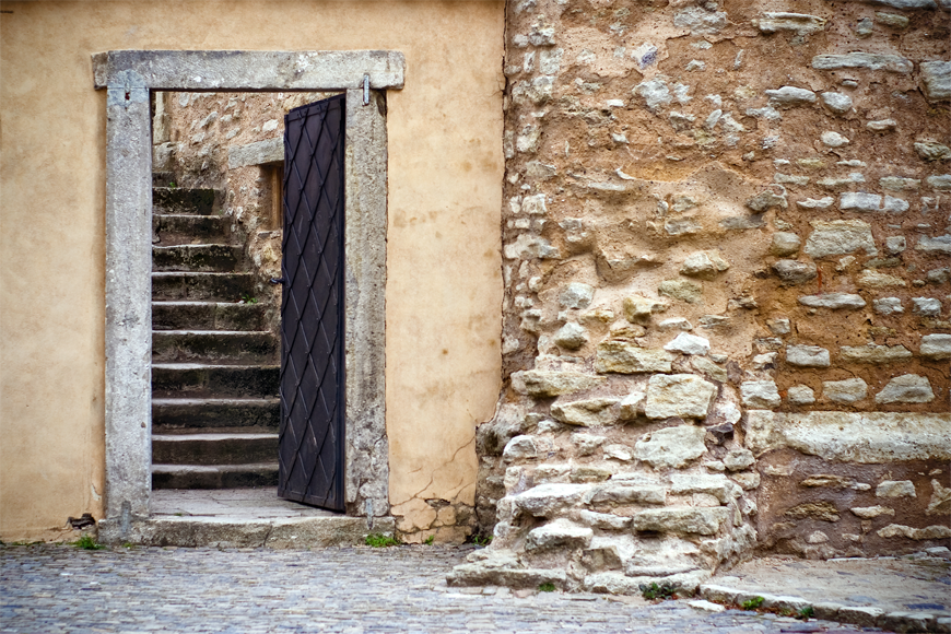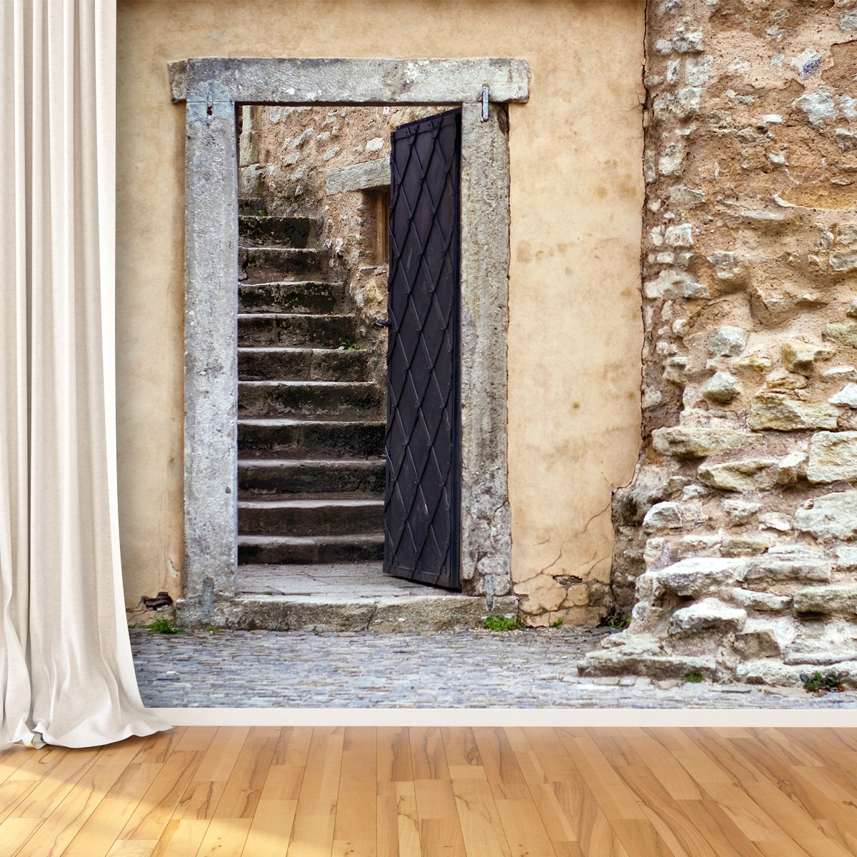 Decora tu salón u oficina con este precioso fotomural de una puerta y fachada antigua de pueblo.